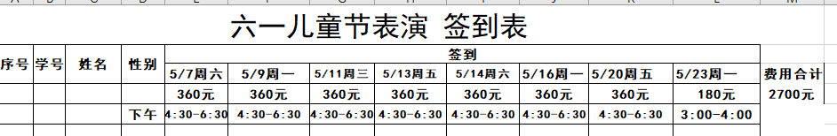 大家假期愉快。 六一舞蹈排练和大家核对收取费用啦。一共22位同学参与舞蹈排练,排练次数明细如下: 5月7、9、11、13、14、16、20日,4:30-6:30 5月23日,3:00-4:00 5月31日,4:30-5:30 费用均摊:2880元/22人=130.91元/人。